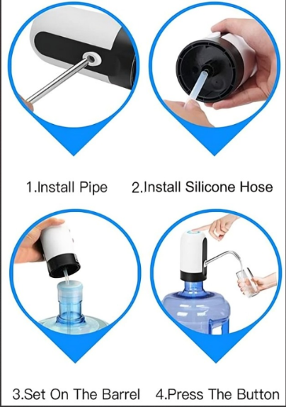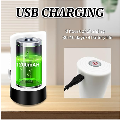 • USB Rechargeable Battery: Built in rechargeable 1200mAh battery. It can be used for 30-40 days or around 4-6 bottles of 5 gallon water once fully charged